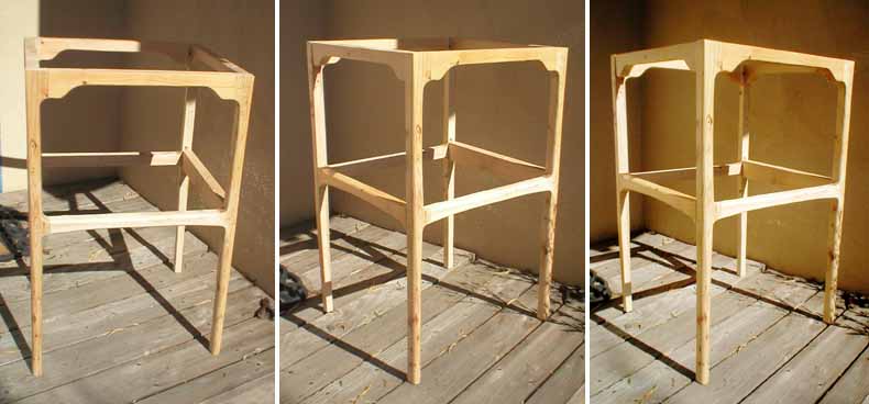 Yes, the bottom of the stretchers/shelf are curved. Yes, the legs do taper from the bottom of the stretchers/shelf, and yes, the front left leg does, in fact, curves. So much for starting with "kiln dried" 2x4s, milling the parts and putting them together right away. Some of the edges still need rounding, shaping and smoothing but so far so good. I now wish I'd allowed for a nicely shaped foot but maybe I'll do that if I ever make somethng like this in "real wood".