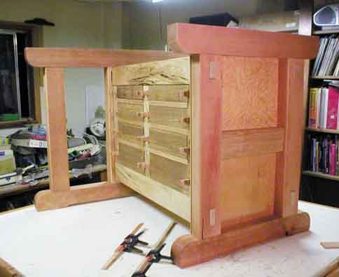 Finally able to see all the finished parts together.The base drawer unit up on blocks and shellaced