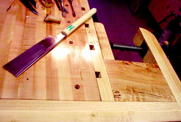Today, 04/28/04, I drilled the last two dogholes and finished Das Bench. Got out some wood, marking gauge, chisels and a dovetail saw. Cutting some half blind dovetails would be a nice way to get to know this bench better.