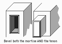 BEVEL THE END OF THE MORTISE AND THE TENON. This will a) make it easier to align the tenon to the mortise, b) eliminate splitting an edge or corner of your tenon and c) leave a little space for glue to go - WHERE IT WON'T BE SEEN LATER. That last point may not seem that important - until you've spent hours getting squeezed out glue off the beautiful piece you spent days, or maybe weeks, making. And if you missed some of that glue squeeze out, when you apply your finish it's probably going to become VERY visible.