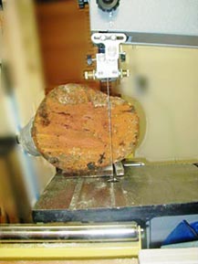 When I got home I spent some time checking out the pieces trying to decide how best to cut them. Set up the bandsaw with two roller stands on the infeed side, one on the out feed side and my workbench behind that roller. Found a redwood board long enough to straddle the rollers and used it as a sled.