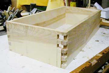 Decided to go with hand cut through dovetails for Module #1, the Red Module, half inch thick sides and bottom, 3/4 inch thick for the top since it will later support the modules which will go on top of it. Did the pins first - chopping out the waste with chisels and then switched to a coping saw to remove the waste between the tails on the side pieces. Good thing in way. Here's why.