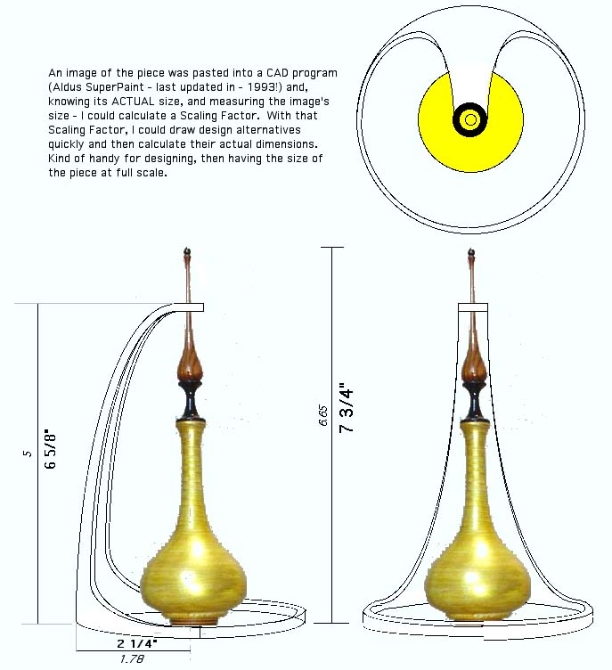 Here's my first cut at Version 2.0 of this Goya Top Idea - an upside down turned tapered cup - with a small hole in the bottom - throug which the Goya Top's finial can be placed. In the Front View, the inside of the cut away cup can act as a nice background for the gold bottle and frame the piece. May metal foil the inside surface of this Stabilizer / Frame. I have some patinaed foil that might work it's gold and red - a nice contrasting background for the Goya Top
