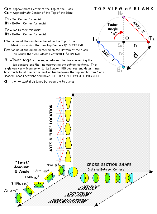 The first illustration is a cleaned up version of Peter Rand's "rooster scratches diagram" for Four Centers, Two Axes. Two Arcs TWISTING, a result of a two week e-mail exchange collaboration with Peter and Barbara Dill (the person who got me into all this to begin with). This annotated diagram shows the variables you have to play with.