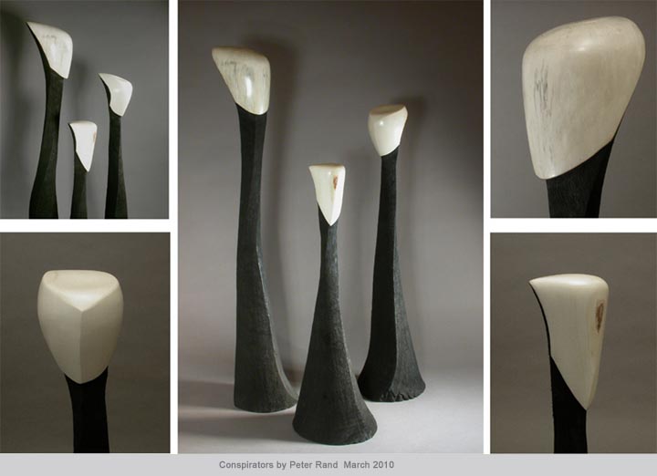 Conspirators - Two colors, THREE axes - with a twist - plus kinetics. Yes, this tryptich group moves, facing each other as if whispering their plot, then one looking around for possible eaves droppers . . .