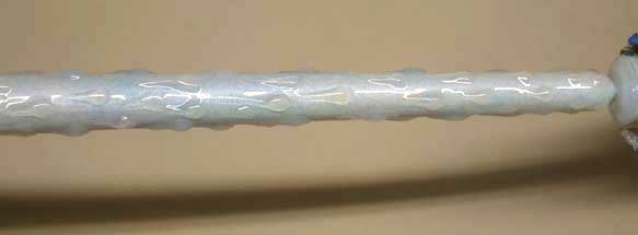 Well, if I hadn't done somethig dumb, the Rain Wand woud be done. See those marks on the upper part of the handle? In order to get the dropplet on the tip of the wand I need to suspend it vertically and dip the tip into the clear Tar Gel. I had a piece of nylon rope handy, so that's what I used. IF the glossy clear Triple Thick had another three or four days to dry completely there wouldn't be a problem. Of course, I didn't wait for it to dry completely. Now I have to refinish the upper part of the handle. Bummer.