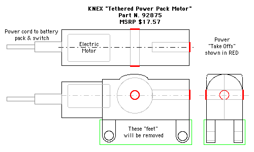 Picked up this K'NEX "Tethered Power Pack Motor" for $4 at a local hobby shop. K'NEX's site lists it at $17.57 . Runs on two AA batteries in the included battery box that has a 3-way switch - foreward, off, backward. Though The motorized "drive" part has two "power take offs" - one through the body and one off the end opposite the power cord. This thing is geared pretty low and should have enough torque to move a lot more wood than the HEXBUG micro robots I've played with earlier.