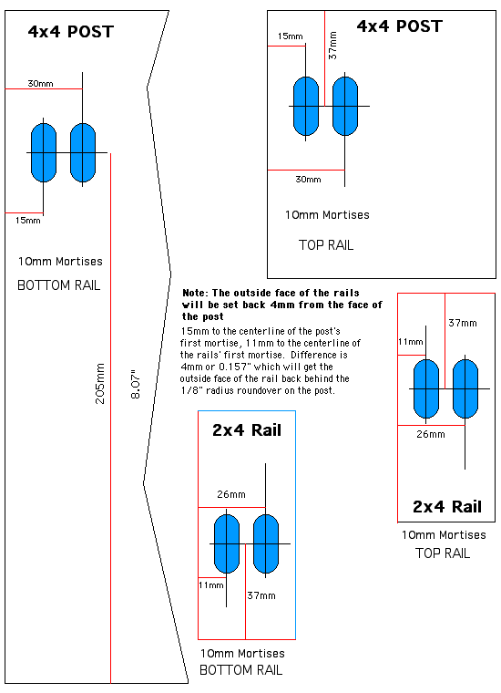Working backwards to get the fence settings for the second mortises - if you start with the Post Fence to Mortise Centerline of 30mm, you can calculate the Rail Fence to Mortise Centerline distance which is 30mm minus 4mm or 26mm.