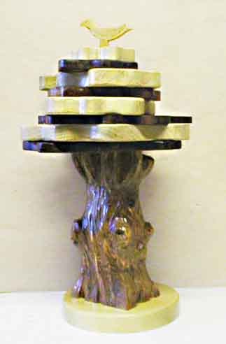 The "leaves" are from some scrap walnut and poplare, the bird on top is canary wood. The base is poplar. If we were to do this again I think sections of walnut dowels between the poplar layers would look more like branches but hey, kid projects are quickies.