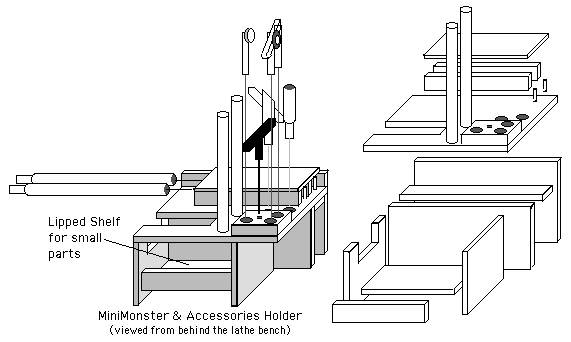 Here's my solution to where to put all this stuff when the MiniMonster isn't mounted on the lathe. Slips over the back of the lathe bench - out of the way - but easy to get to. Also makes it easier to transport and sits flat and stabile when off the lathe bench.