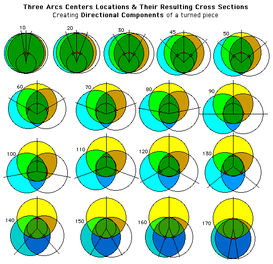 The head's cross section is basically TRIANGULAR - THREE intersecting ARCS, turned on THREE AXES , all turned to the same diameter and whose centers are equidistant from the blank's center. WHERE you place the centers of the three arcs gives you a lot of options for the shape of the head, as you can see in the following illustration. And because you can make the triangular cross section asymetric you can give the head a definite front, sides and back. That means you can make the head face in any direction you want, relative to the torso.